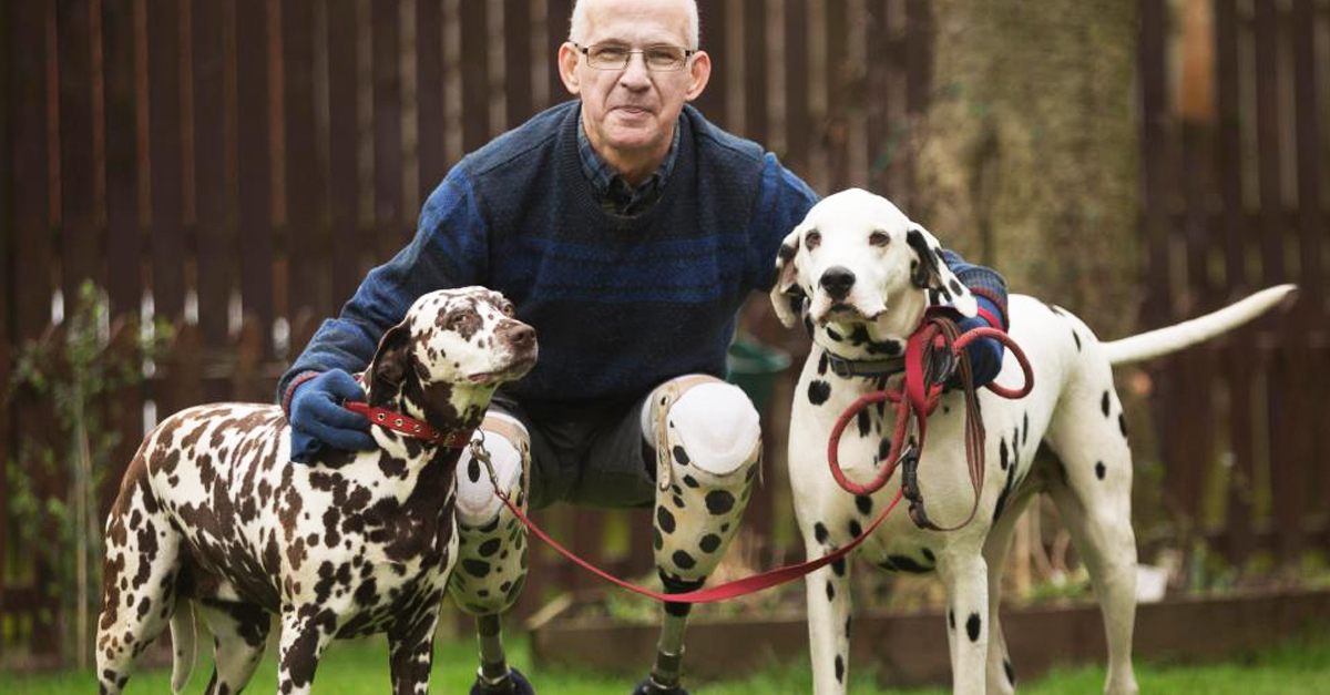 Gordon Sanderson, a 60 éves nagypapa ugyanolyan pöttyös, mint imádott dalmatái - legalábbis ami a térdtől lefelé viselt protéziseit illeti. Gordonnál 17 éves korában állapították meg a cukorbetegséget, ám őt ez sosem tartotta vissza attól, hogy boldog, teljes életet éljen. “A betegségem miatt először csak a lábfejemet amputálták, remélve, ez elegendő lesz. Sajnos nem így történt. - meséli a Daily Mailnek. - Így aztán térd alatt kellett elvégezni az amputációt, amit 2010-ben a másik lábamon is el kellett végezni.”